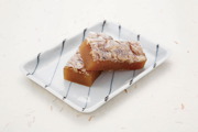 ゆべしのうえに大粒のクルミがぎっしり。名前の「大直利」には「鉱石の多い部分」の意味があり、慶長4年(1599)、金鉱の発見により尾去沢鉱山が始まったことにもちなんでいます。