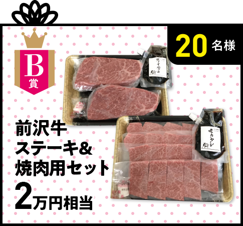B賞:前沢牛ステーキ&焼肉用セット 20,000円相当 20名様