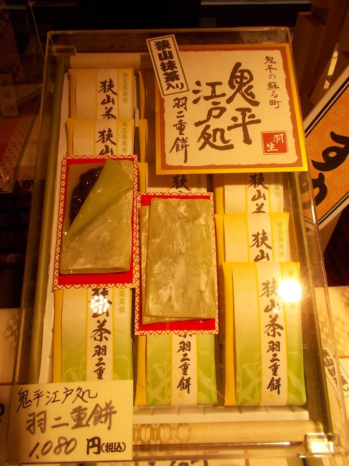 絹のようにきめ細やかで、柔らかな餅菓子で狭山抹茶入りの羽二重餅です。