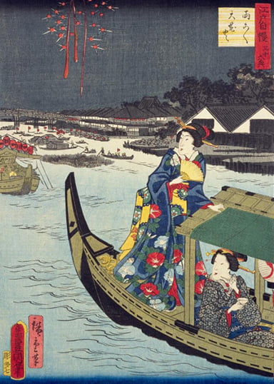 江戸時代、隅田川では5月28日から8月28日が納涼期間とされ、川べりには食べ物屋や夜店が並び賑わいました。両国橋で大花火が打ち上げられたのは享保18年(1733年)、幕府が大飢饉や、疫病による死者の供養のため水神祭を行った際、両国の花火師鍵屋が、余興として花火を打ち上げたのが始まりです。今に伝わる「玉屋~、鍵屋~」の掛け声は、この鍵屋と暖簾分け店の玉屋の競い合いに端を発しています。