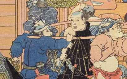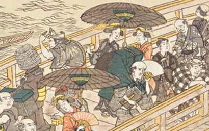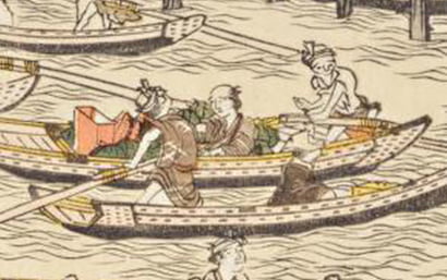 江戸では渡し舟が交通の要。後から乗ってきた人のために拳一つ分だけ腰を浮かせて席を