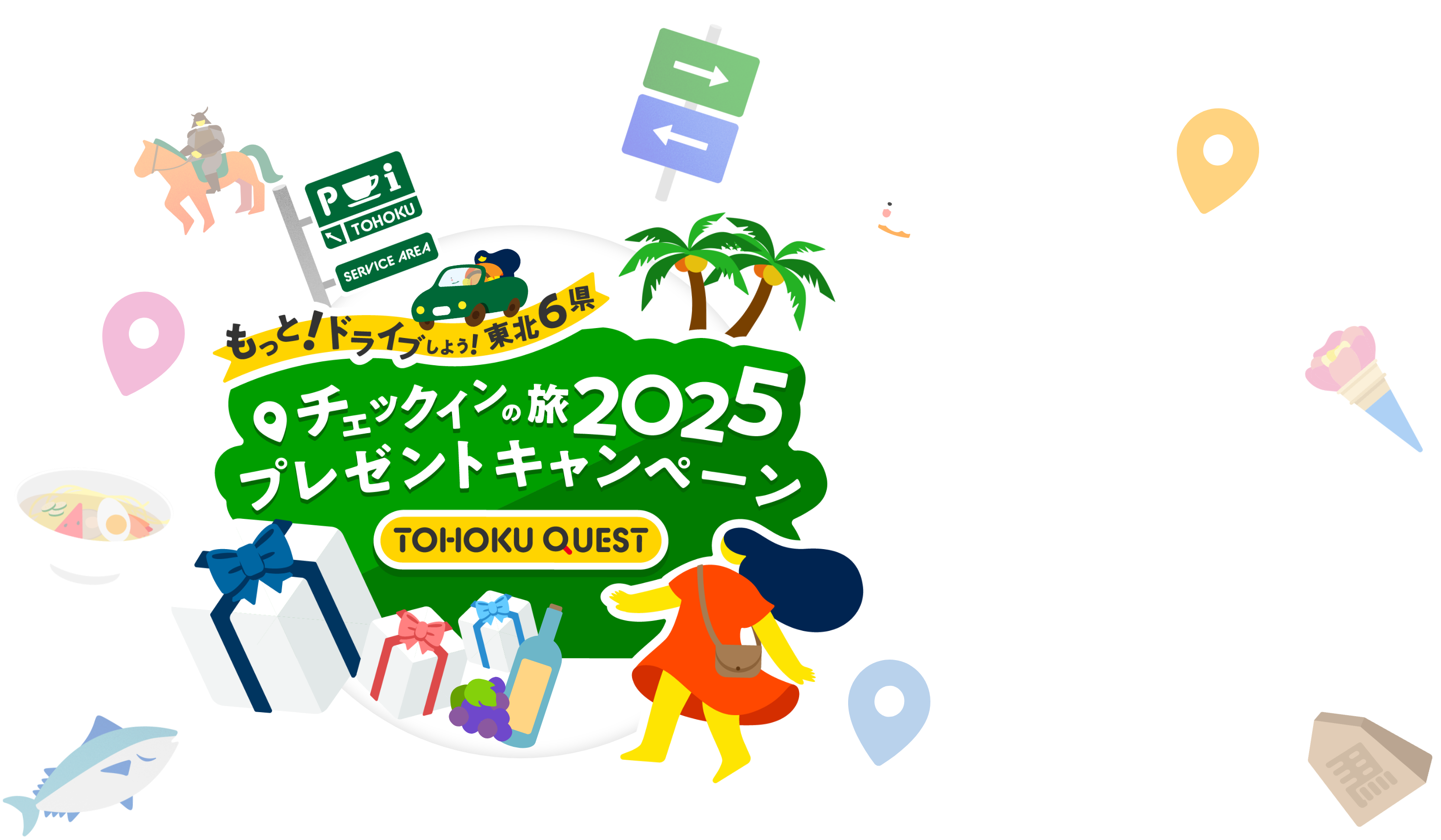 - プレゼント応募でご入力いただいた個人情報はTOHOKU QUESTの運用(プレゼント当選者へ賞品発送のため配送伝票への記載を含む)にのみ、使用するものとします。主催者であるNEXCO東日本、青森県、岩手県、宮城県、秋田県、山形県、福島県は次の場合を除き、利用者の同意なしに第三者に開示・提供することはありません。