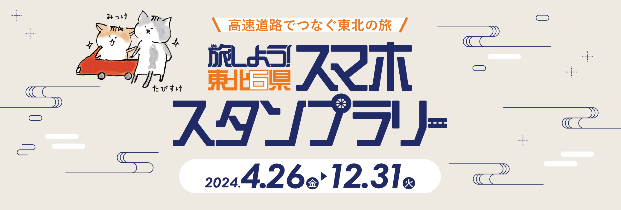 - プレゼント応募でご入力いただいた個人情報はスタンプラリーの運用(プレゼント当選者へ賞品発送のため配送伝票への記載を含む)にのみ、使用するものとします。主催者であるNEXCO東日本、青森県、岩手県、宮城県、秋田県、山形県、福島県及び事務局は次の場合を除き、利用者の同意なしに第三者に開示・提供することはありません。