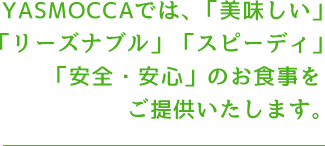 全てのYASMOCCAで「鶏唐揚定食」や「生姜焼定食」をご提供するほか、高速道路の定番メニューである、そば・うどん・カレーなども取り揃え「いつもの、安心の味」をご提供いたします。