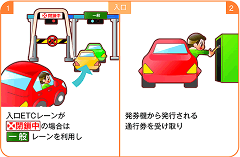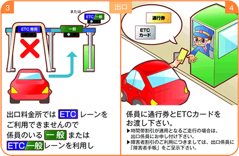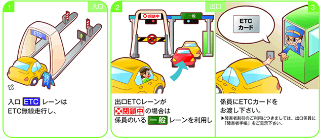 2.出口料金所のETCレーンが閉鎖されていた場合(もしくは、ETC未設置の料金所の場合)は、以下の方法によりご利用ください。