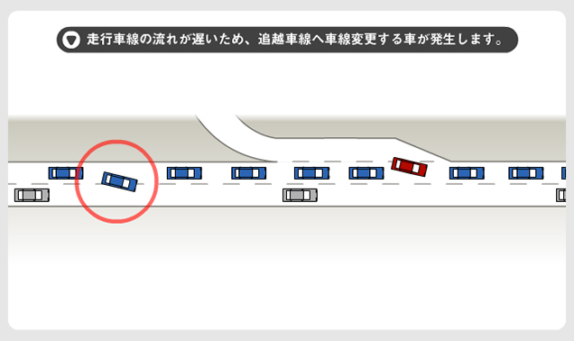3.走行車線の流れが遅いため、追越車線へ車線変更する車が発生します