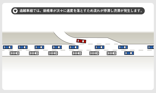 5.追越車線では、後続車が次々に速度を落とすため流れが停滞し渋滞が発生します