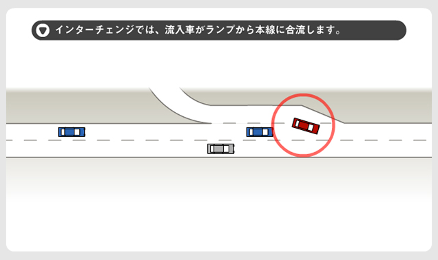 1.インターチェンジでは、流入車がランプから本線に合流します