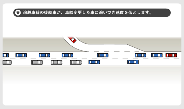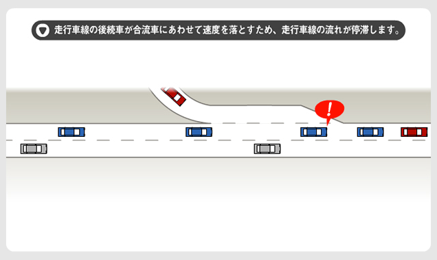 2.走行車線の後続車が合流車にあわせて速度を落とすため、走行車線の流れが停滞します
