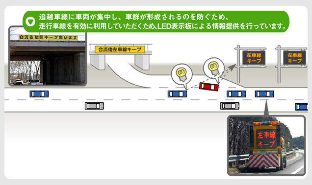 3.追越車線に車両が集中することで車群が形成されるのを防ぎ、走行車線を有効に利用していただくため、LED表示板による情報提供を行っています