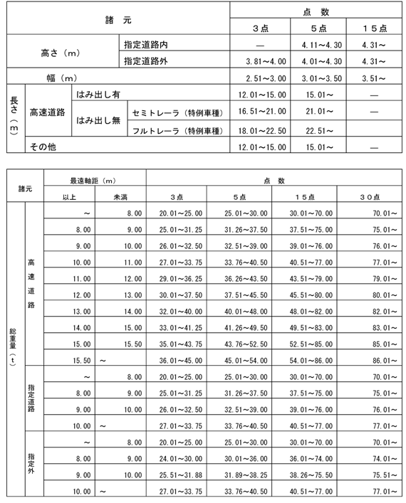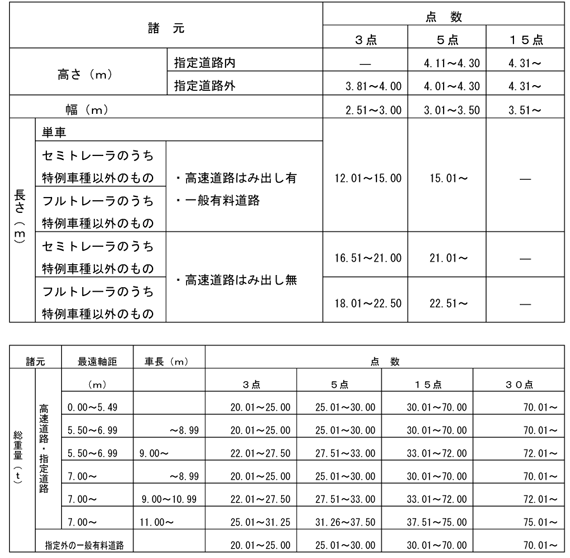 [大型・特殊車両や危険物積載車両を運転される方へ] 点数表