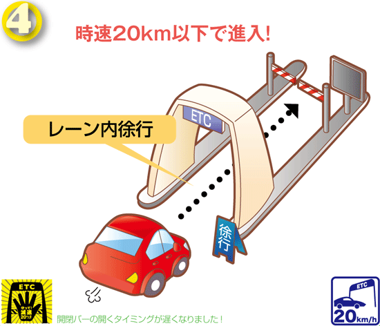 - ETCシステム利用規程により、20㎞/h以下に減速して進入し、ETCレーン内は徐行して通行することと定めております。