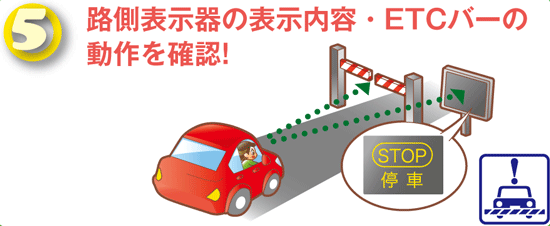 - ETCレーン内では徐行し、路側表示器の表示内容、ETC開閉バーの動作を確認して通行してください