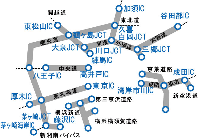 東北道(川口JCT~加須)、常磐道(三郷~谷田部)、関越道(練馬~東松山)、東関東道(湾岸市川~成田)、新空港道、東京外環道、東名高速(東京~厚木)、新東名高速(海老名南JCT~厚木南)、中央道(高井戸~八王子)、京葉道路、第三京浜道路、横浜新道、横浜横須賀道路、圏央道(茅ヶ崎JCT ~久喜白岡JCT )、新湘南バイパス(茅ヶ崎海岸~藤沢)※