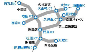 名神高速(大津~西宮)、新名神高速(城陽~八幡京田辺JCT、高槻JCT~川西)、中国道(中国吹田~西宮北)、