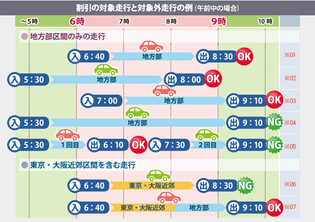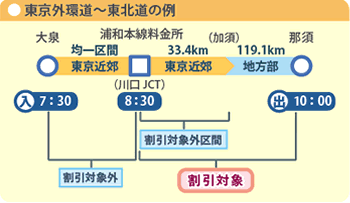 - 入口料金所または出口料金所を6時~9時の間または17時~20時の間に通過してください。