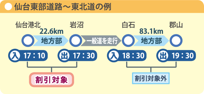 仙台港北~岩沼間は、入口料金所と出口料金所を17~20時の間に通過していますので、平日朝夕割引の対象走行となります。(ご利用回数にカウント。割引率の適用対象。)白石~郡山間は、入口料金所を17~20時の間に通過していますが、夕方の時間帯の2回目になりますので、平日朝夕割引の対象外になります。(白石~郡山間は高速国道であるため、大口・多頻度割引の対象となります。)