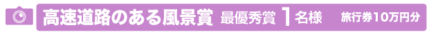 - 「高速道路のある風景」部門の最優秀賞である森順さんの「ヘッドライト&テールライト」が代表作です。長時間露光による作品の応募はここ数年増えていますが、北海道の最も忙しいインターチェンジの一つを撮影場所に据えたことがポイントになっています。往路と復路のカーブの違いや地平線に消えてゆく照明など、光による空間感を定着しています。前者は自動車のライトの軌跡の作る造形の妙味ですが、同時に単なる美しさを超え、交通や流通といった社会の躍動感が表れています。