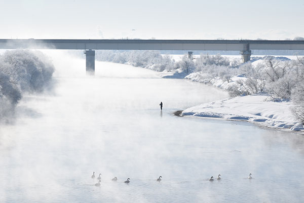 同部門優秀賞の『釣り人』(今井秀幸さん)は今までにない切り口の作品でした。冬の風景の白を基調とした画面の、コントラスト強い高速道路の色調にまず視点が引き込まれます。次にその下の小さな釣り人の姿を発見し、さらに手前には湯気の中に佇む水鳥と誘導されます。再び画面上部に目を移してみれば道路を疾走する車の屋根、さらに遠くにはかすかに航空機の離陸が見えてきます。十二分に余白を生かした水墨画や書のような世界感でした。