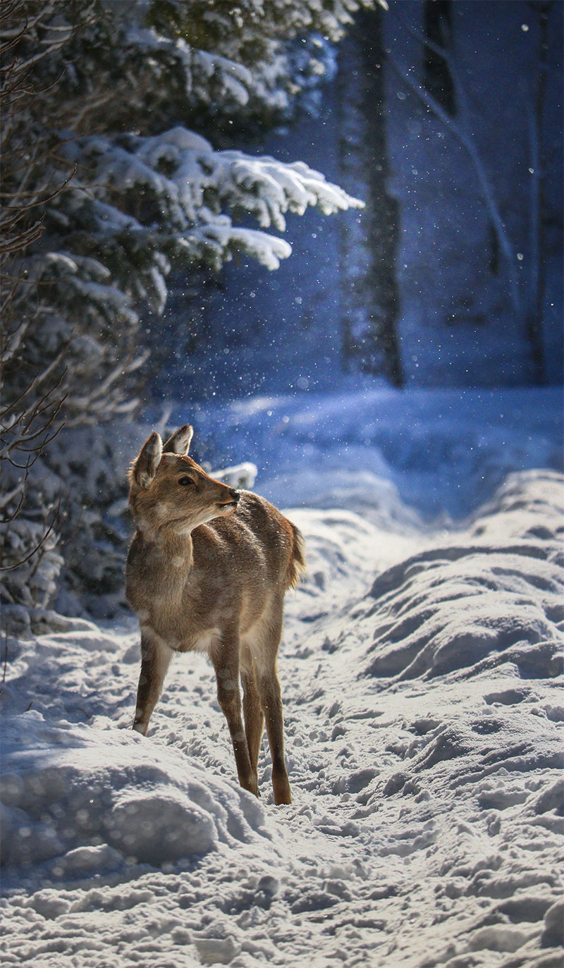 「シャッターチャンス」の魅力を代表するのは、「北海道の四季」部門のhiroさんの『雪の中の妖精』でしょう。丹頂鶴、ナキウサギ、サラブレットなど、本コンテストでも動物たちを追った写真は多いですが、「北海道の四季」部門初の動物写真による最優秀賞です。目の前に「パッとでてきた一頭の鹿」を撮ったとのことですが、鹿の表情や毛の質感、舞い散る雪と空気感、遠近に展開する光と影、硬軟のフォーカス(ピント)が相まって、白昼夢のような一瞬を記録しています。「名人」も多い動物写真の分野では、被写体をドキュメンタリー、あるいは抒情性・ドラマ性で捉える場合が多いですが、hiroさんの作品には今のコンテストには見ないテイストが感じられました。