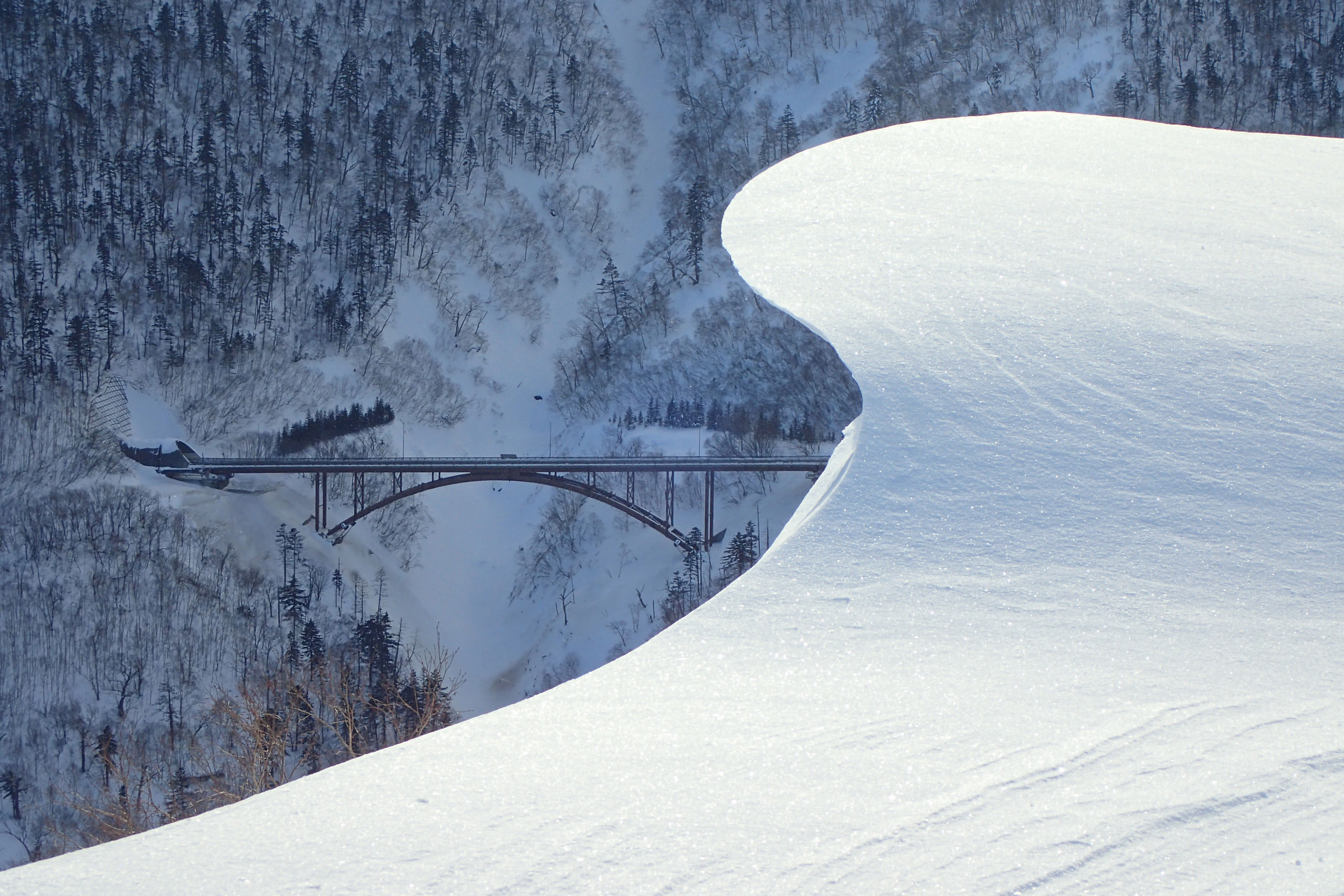 「冬賞」の『日勝峠の雪庇』(穂刈正昭さん)も、雪と風が作った偶然の造形をすかさず記録した作品です。画面を二分割した雪庇の奥に、やはり弧を描く日勝大橋とトンネルがあるという妙。北海道の冬の厳しさが伝わるとともに、偶然と人工の曲線の対比が美しくユーモア感もある作品でした。