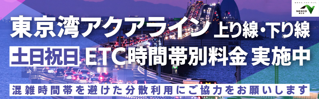 • 東京湾アクアラインでは、現在、土日・祝日の混雑緩和のためETC時間帯別料金(社会実験)が実施されています。