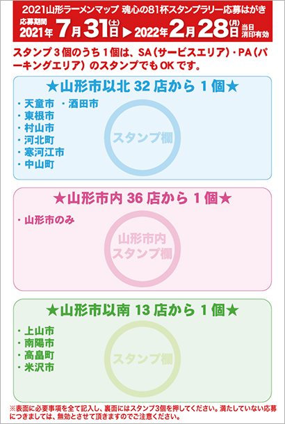 山形市/山形市以北/山形市以南 の各地域から、2地域を選択して各1店ずつ押印