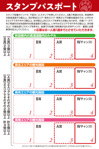 A賞をご希望の方は、スタンプパスポートに、秋田県内の高速道路内で3個以上、及び県北エリア・県央エリア・県南エリアのうち、いずれか2エリアでそれぞれ3個以上、計9個以上のスタンプを押してください(B賞は秋田県内の高速道路内で2個以上、2エリアで各2個以上、計6個以上)。スタンプ欄16個すべてを押された方は、さらに特別賞の抽選対象となります。スタンプパスポートの裏面に必要事項を記入し、所定の料金の切手を貼付のうえ投函してください。