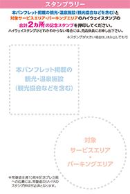 - パンフレット掲載の観光・温泉施設及び福島県内の対象サービスエリアまたはパーキングエリア備え付けのスタンプをハガキ裏面の所定位置に押印。なお、常磐道全通10周年記念プレ企画への応募には、常磐道のSA・PAのスタンプ押印が必須となります。