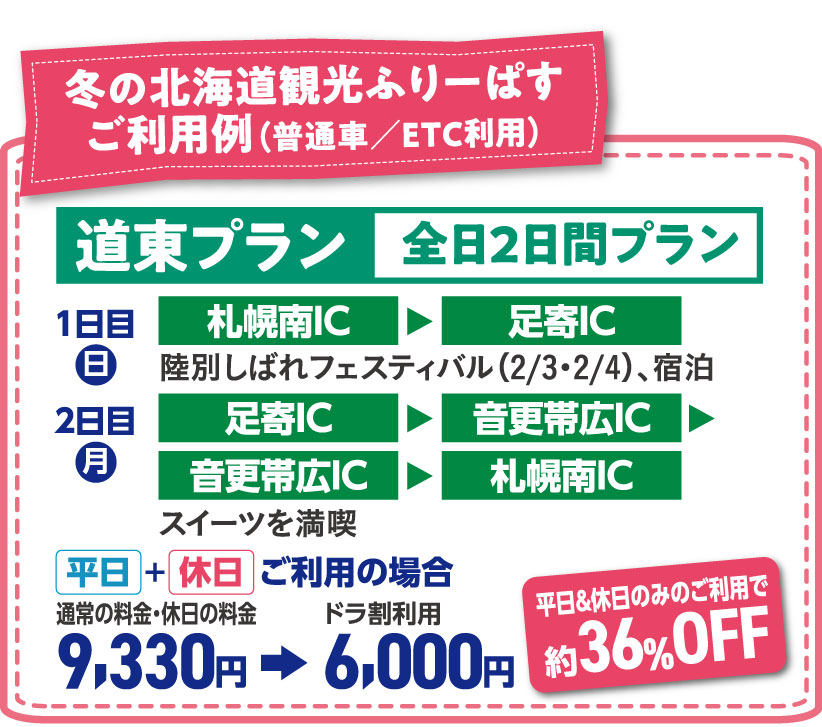- ご利用日(申し込み後)に一度でも走行があった場合は、「冬の北海道観光ふりーぱす」の料金となりますので、ご出発前に天候と高速道路の交通情報をお確かめください。ご走行前であれば取消は可能です。取消の際、ログインできない場合は、NEXCO東日本お客さまセンターまでお知らせください。