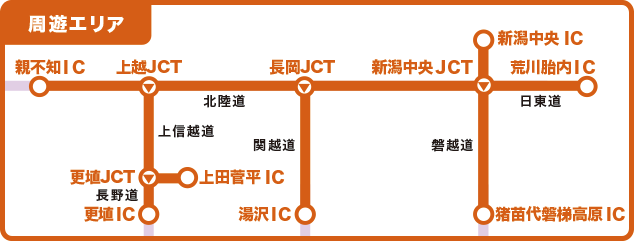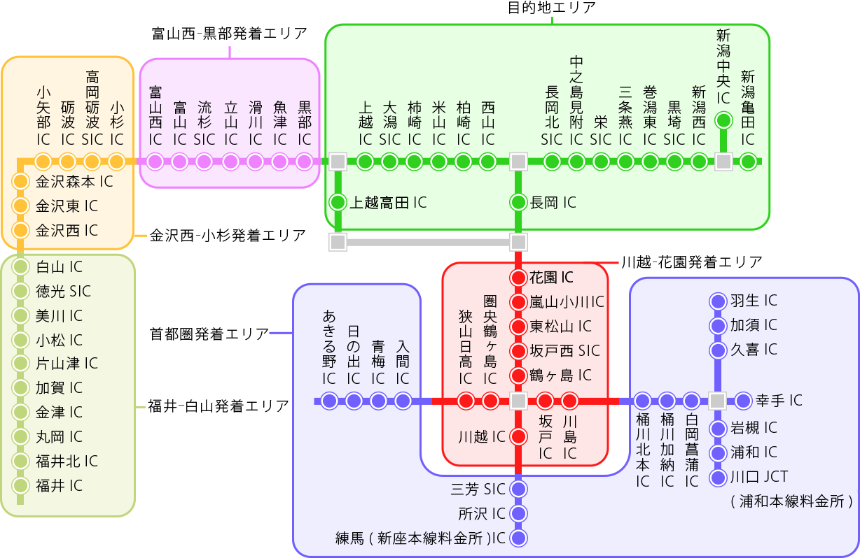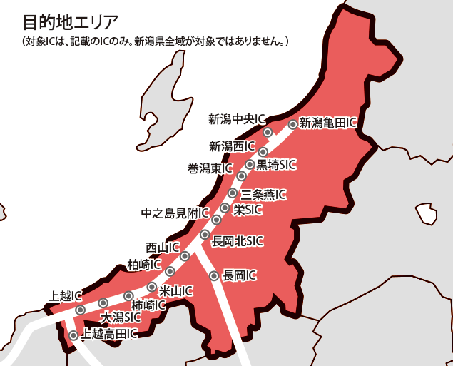 首都圏、川越-花園、福井-白山、金沢西-小杉、富山西-黒部発着エリアから、新潟県内目的地エリアへの1往復分の通行料金がお得に!