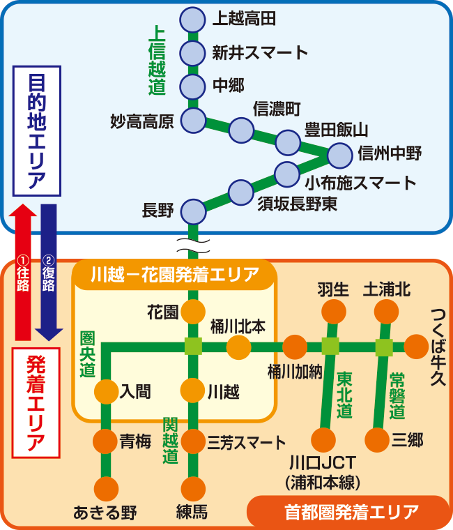 - 首都高速・外環道を経由した場合、関越道・東北道・常磐道への入口となる本線料金所が往路の入口となるため、乗り直しは不要です。(本線料金所までの料金が別途必要です)