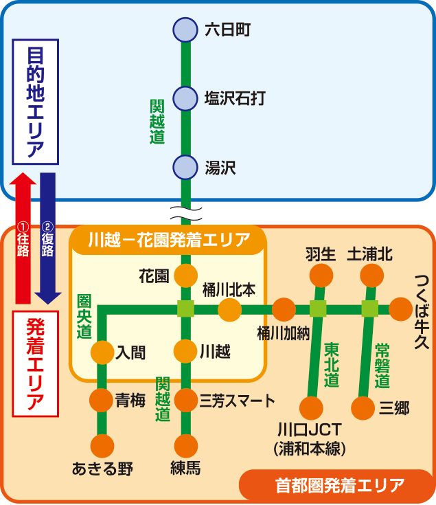 - 首都高速・外環道を経由した場合、関越道・東北道・常磐道への入口となる本線料金所が往路の入口となるため、乗り直しは不要です。(本線料金所までの料金が別途必要です)