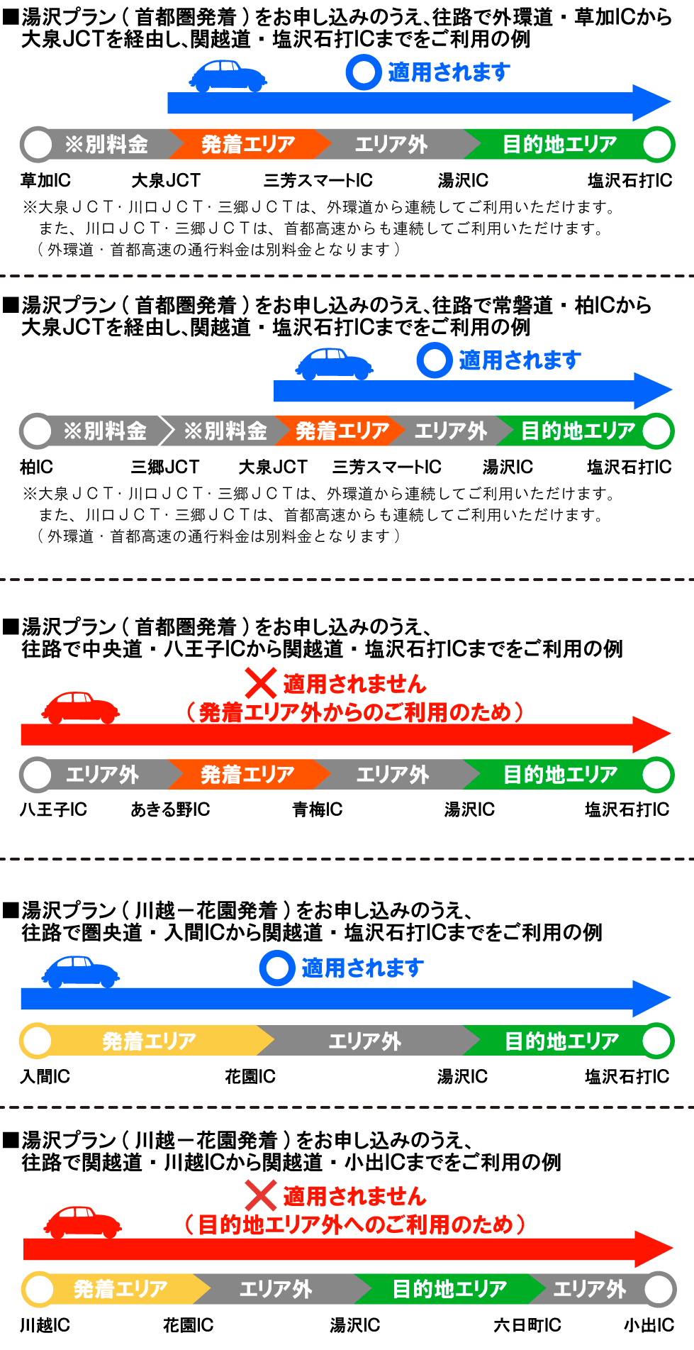 - 往路・復路ともにエリア外からご利用の場合、一度高速道路を降りてエリア内のICから乗り直してください。