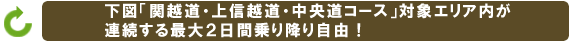 「関越道・上信越道・中央道コース」は、最大2日間、対象エリアの高速道路が定額で乗り降り自由となります。