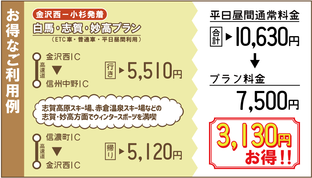 【往路】金沢西IC → 信州中野IC 5,510円(ETC通常料金) ⇒ 本商品適用後、