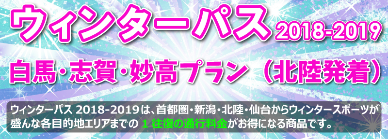 ●ご利用区間・曜日・時間帯によっては、「ウィンターパス 2018-2019」をご利用いただくと割高となる場合がございます。通行料金については、高速料金・ルート検索にてご確認ください。