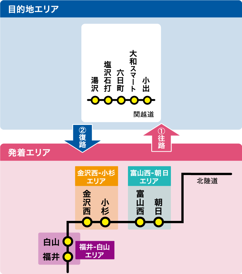 - 往路・復路ともにエリア外からご利用の場合、一度高速道路を降りてエリア内のICから乗り直してください。