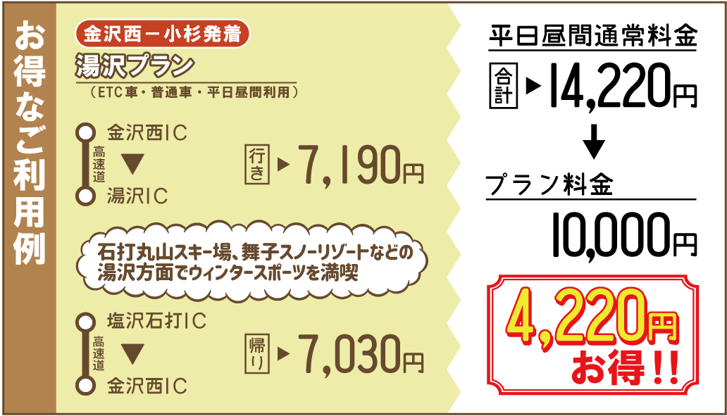 【往路】金沢西IC → 湯沢IC 7,190円(ETC通常料金) ⇒ 本商品適用後、