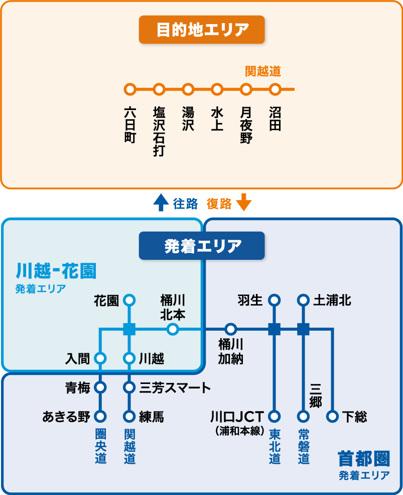 - 外環道・首都高を経由した場合、関越道・東北道・常磐道への入口となる本線料金所が往路の入口となるため、乗り直しは不要です。(本線料金所までの料金が別途必要です)