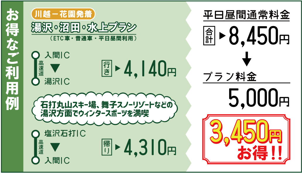 【往路】あきる野IC → 塩沢石打IC 4,800円(ETC通常料金) ⇒ 本商品適用後、