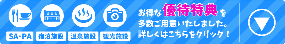 宿泊施設でのワンドリンクサービス、観光施設での料金の割引やプレゼント、SAレストランでのコーヒー1杯無料サービスなどのお得な特典を受けることができます。