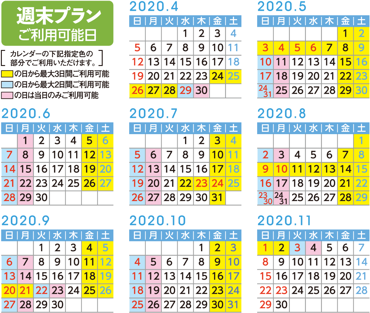 2020年4月24日から2020年11月4日まで、連続する4日間・5日間・6日間からお選びいただき、曜日の限定なくご利用できます。(最終のご利用開始日にご注意ください。)