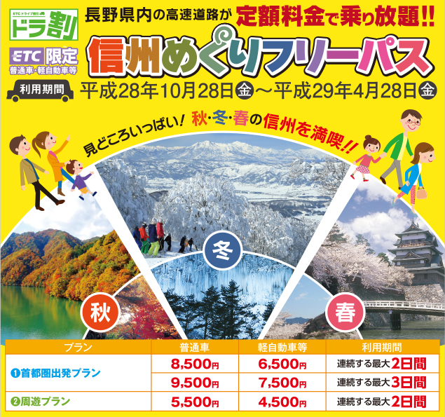 「2017/5/12~2017/11/27までの連続する2日間または3日間。長野県の高速道路が乗り放題!※NEXCO中日本のページに移動します」