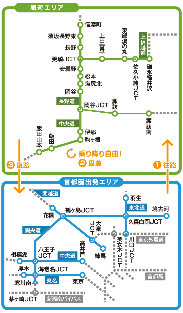 - ●ただし、①の往路走行をされた後であれば周遊走行において周遊エリア内のIC⇔周遊エリア外のICをご利用の場合、周遊エリア内の区間のご利用分は本プランに含まれます。