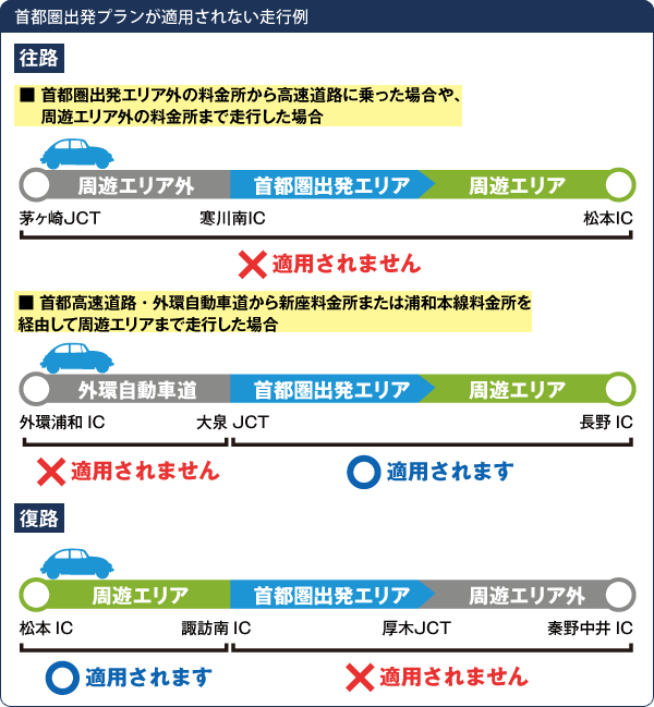 - 往路・復路では対象エリア以外のインターチェンジ(IC)での乗り降りはできません。