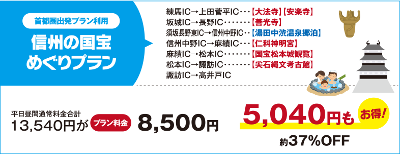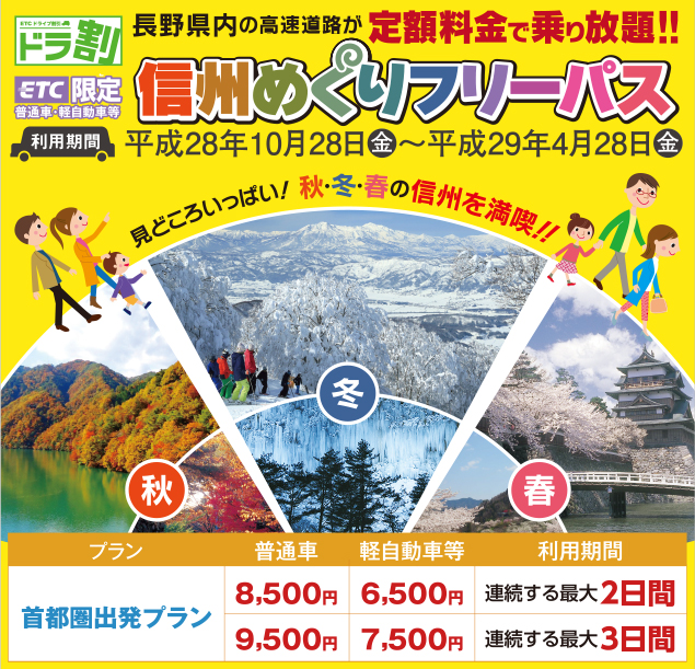 | 料金支払 | ドラ割「信州めぐりフリーパス」の料金はETCカードより、ご利用後に一括決済いたします。 周遊エリア外料金は、ドラ割料金とは別途、通常の料金(ETC時間帯割引が適用される場合、ETC時間帯割引適用後の料金)をETCカードにより決済いたします。 |