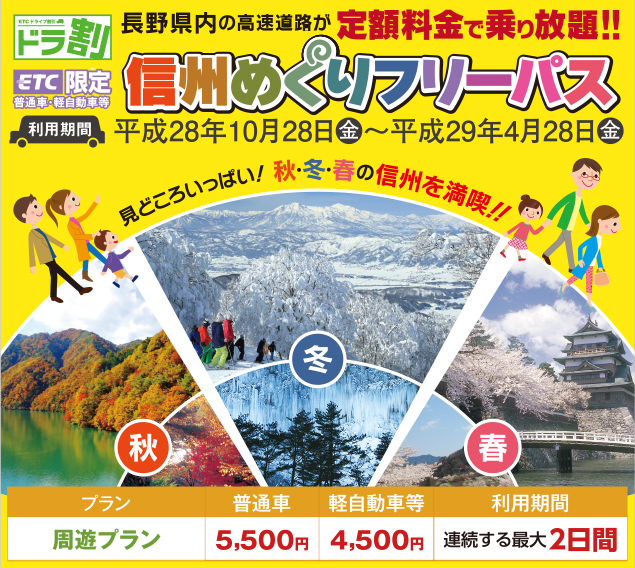 | 料金支払 | ドラ割「信州めぐりフリーパス」の料金はETCカードより、ご利用後に一括決済いたします。 周遊エリア外料金は、ドラ割料金とは別途、通常の料金(ETC時間帯割引が適用される場合、ETC時間帯割引適用後の料金)をETCカードにより決済いたします。 |