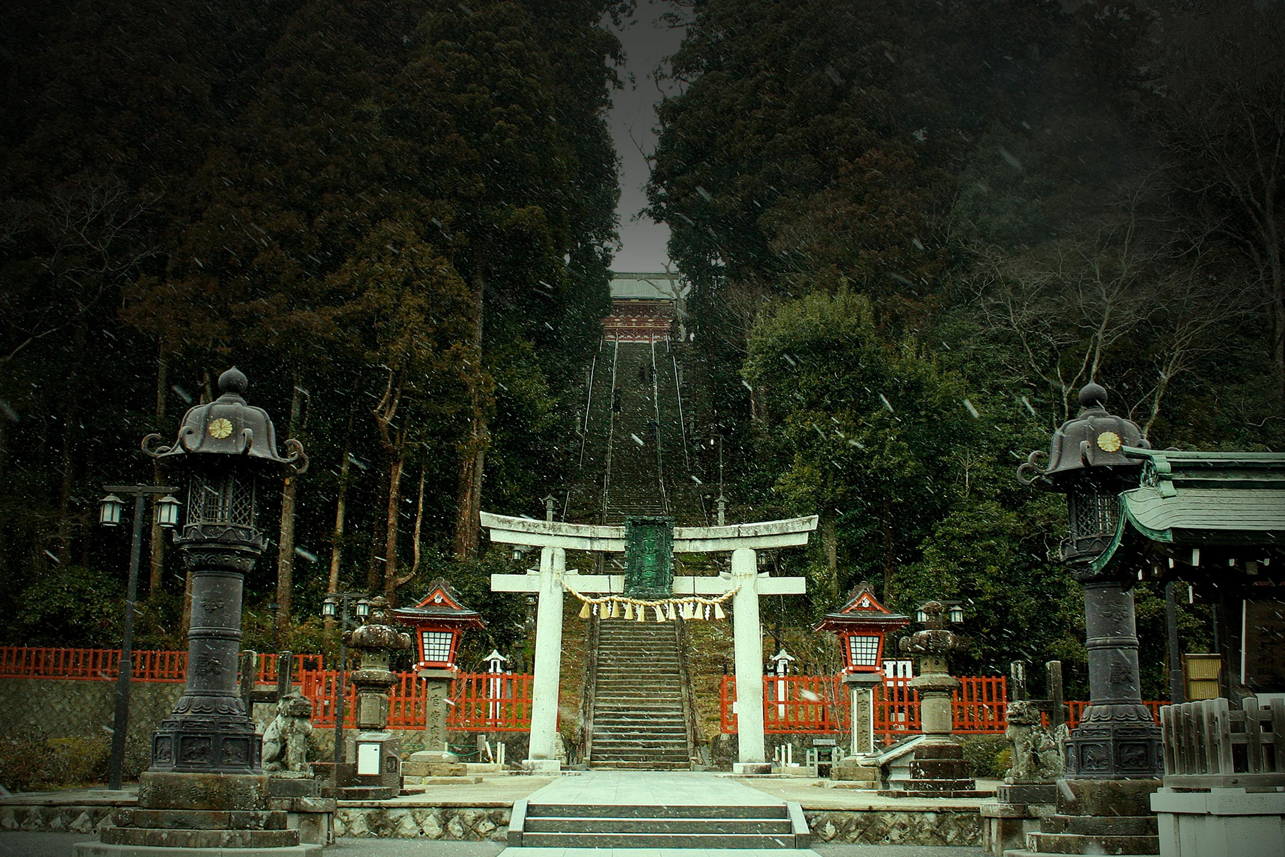 本格的に降り始めた雪の中、お年寄りが足を引きずるようにして参道を登っていた。私も一歩ずつゆっくりと登り始めた。ユーモラスな表情の狛犬が優しく見送ってくれる。