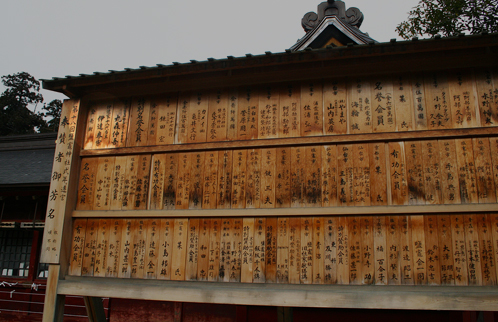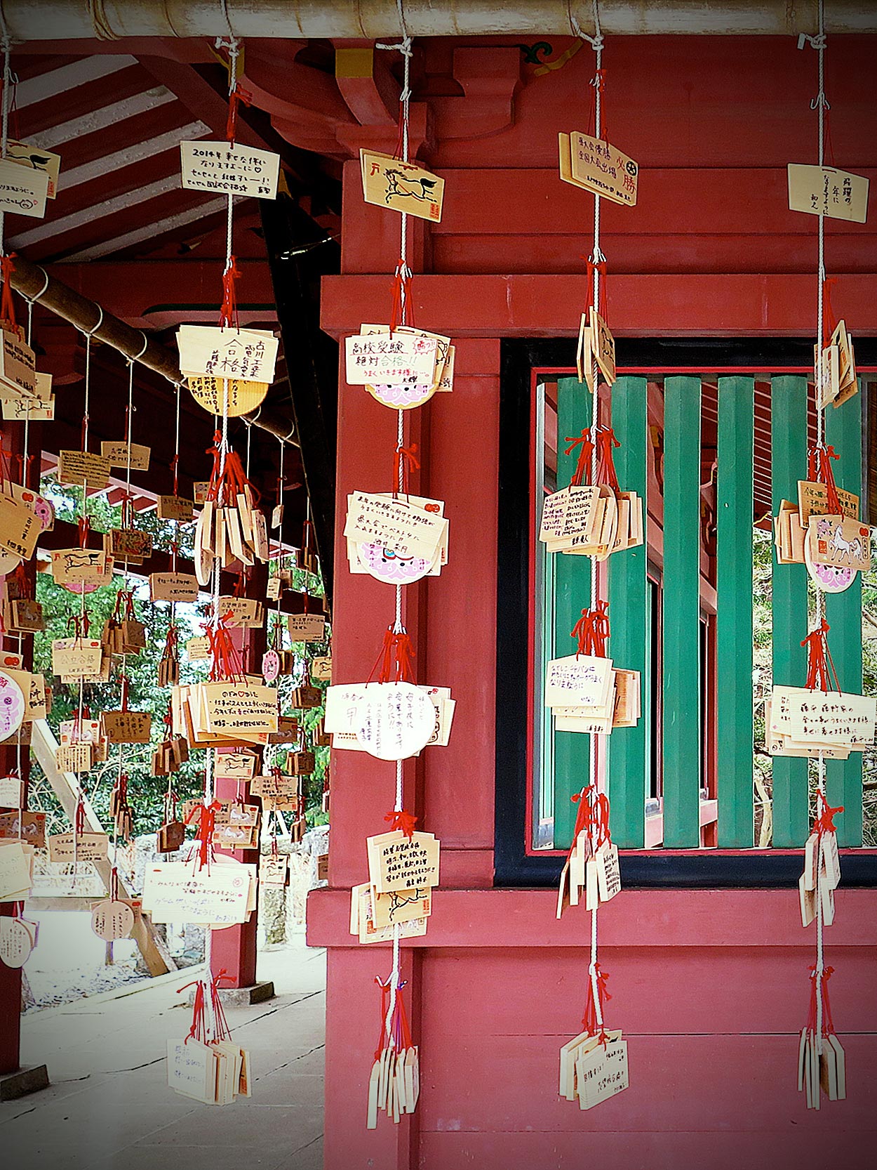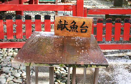 境内には、大勢の人が描いた絵馬がずらりとぶら下がっていた。合格祈願に家内安全といった定番のお願いの他にも「K君とラッブラブになりたい!」「嵐ライブが当たりますように」なんていうのもある。さらに進むと、「献魚台」と書かれた看板があった。